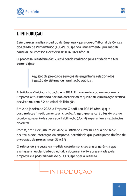 Introdução 1. O presente Parecer Técnico tem como objetivo analisar o pedido de Suspensão Liminar de Processo Licitatório (doc. 1), solicitado pela Empresa X, pessoa jurídica de direito privado, inscrita no CNPJ/MF sob o nº 00.000.000/0001-00, com sede na Rua A, nº XX, Brás, CEP. 00000-000, São Paulo/SP, neste ato devidamente representada por seu sócio Sr. Fulano de Tal, brasileiro, portador da Cédula de Identidade de RG nº 00.000.000-0 e CPF/MF nº 000.000.000-00. |
